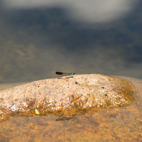 Sometimes, as below, i prefer the image with the reflections, here of the clouds reflecting into the pool behind the demoiselle and its own reflection. The image on the right, using the polorizor appears less interesting. As always, try and experiment for yourself.