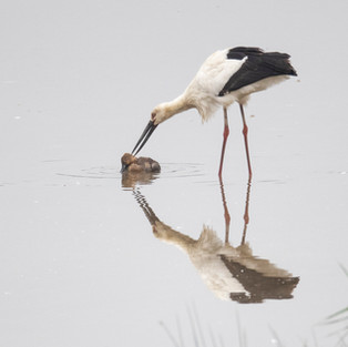 There was no aggressive stabbing of its prey, and at one point the stork lifted the head of the duck as below. It did not seem to want to kill it, or try and tear it apart and eat it...so I am quite bemused by this behaviour.